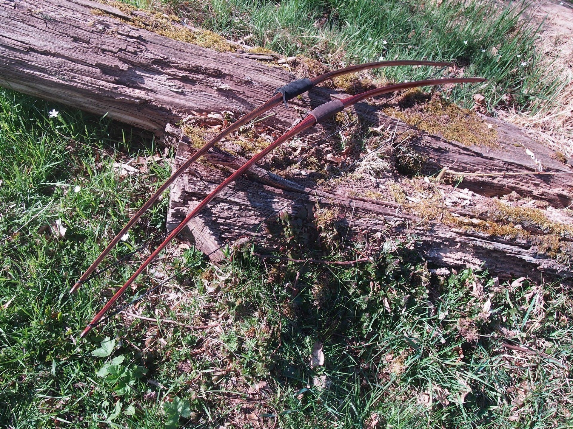 Bambuskomposit-Langbogen Madake-Bambus für Rücken und Bauch, Kern aus Ipé mit 6 hochkantverleimten Streifen aus Madake-Bambus, Griffkeile aus Osage, Lemonwood, Ulme oder Eiche, Hornoverlays und Arrowplates beidseitig bis 50 lb. € 750,- höhere Zuggewichte gegen € 25,- Aufpreis je 5 lb.,bis max. 60 lb.